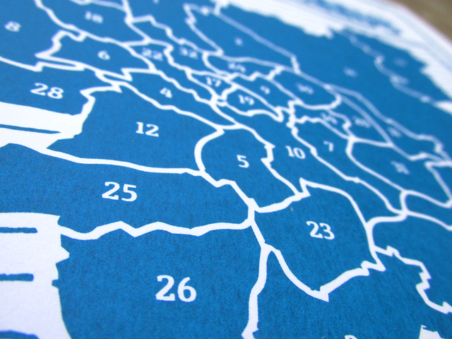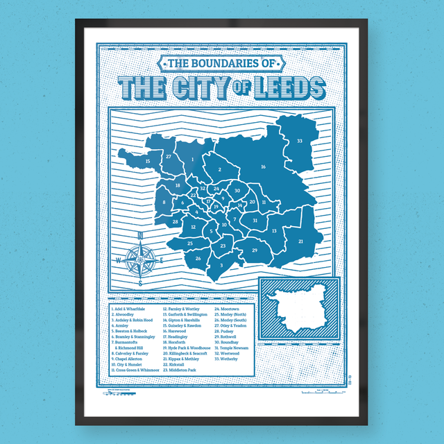 A vintage map style print depicting the 33 wards of the City of Leeds in West Yorkshire. Inspired by old maps and my home city.